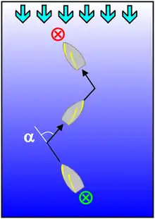 Cette manœuvre est typique d'un voilier cherchant à remonter le vent en effectuant un louvoyage : Ne pouvant pas naviguer face au vent, il enchaîne les virements de bord pour former une trajectoire en zigzag.