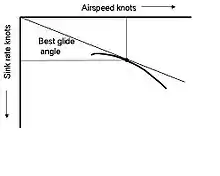 La figure ci-contre représente la polaire des vitesses d'un planeur. L'abscisse correspond à la vitesse-air de l'aéronef et l'ordonnée correspond à la vitesse de chute. Le plané sera le meilleur possible lorsque l'angle de plané sera le plus petit possible ; angle minimal obtenu lorsque la droite d'origine O est tangente à la courbe de la polaire[1],[2].