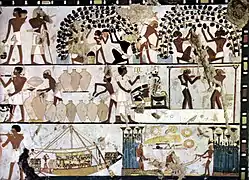 Les premières traces de vin connues datent du néolithique : des archéologues ont trouvé à Zagros en Iran, des amphores de vin vieilles de 7500 ans[26]. La première représentation des procédés de vinification, elle, est le fait des Égyptiens, remontant au IIIe millénaire avant Jésus Christ (sur des bas-reliefs représentant des scènes de pressurage et de vendange, datant de 2500 av. J.-C.). En revanche, il est bien difficile de dater le début de la viticulture. Le raisin de ces vins était-il une lambrusque, vigne sauvage, ou déjà cultivée ? Les historiens hésitent entre la région de Transcaucasie au sud de la mer Caspienne où se trouvent la plus grande variété de vignes sauvages au monde, et la région entre la Palestine et la Mésopotamie[26]. De ces régions, la vigne va rapidement gagner tout le croissant fertile.