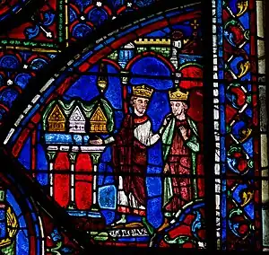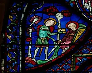 Certaines scènes du vitrail de Chartres rappellent celles de Saint-Denis, mais elles sont des compilations de plusieurs textes : la légende du pèlerinage de Charlemagne composée à Saint-Denis, la chronique du Pseudo-Turpin et la légende de saint Gilles.
