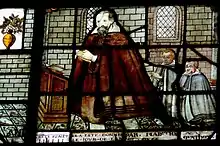 Inscription : CETTE VITRE A ETE DONNEE PAR MAITRE AUDIFER LE JOUR DE L'AN 1614 (panneau du donateur, en bas) ; 1860 (bordure, en haut) ; M., V. et A. entrelacés (sur la bordure, 2 fois).