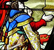 - l'élément principal se trouve au milieu du vitrail, au-dessus d'un socle moderne, et occupe toute sa largeur. Il a pour sujet le jugement de Salomon.