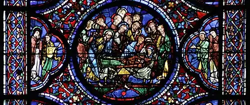 Le vitrail décrit comment, suivant la tradition chrétienne, après la mort de la Vierge (dormition), elle fut élevée corporellement au Ciel (Assomption), et couronnée au Ciel par son Fils. Cette tradition ne repose pas sur les écritures du Nouveau Testament, mais sur la tradition chrétienne et des écrits apocryphes très populaires au Moyen Âge[2], et qui seront quelque temps plus tard (vers 1260) rassemblés par Vincent de Beauvais dans son Speculum maius[3], ou dans la Légende dorée de Jacques de Voragine[4]. Le texte le plus ancien est l'apocryphe de la Dormition de Marie[5], attribué à Méliton de Sardes, voire à Saint Jean lui-même[3].