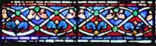 Les scènes des médaillons et quadrilobes sont sur fond bleu. Les disques et demi-disques sont de diamètre plus grand que les quadrilobes associés, et au-delà d'un filet rouge interne, leur diamètre est encore accentué par le placement des bordures bleue et blanche à l'extérieur de la ferronnerie. À l'inverse, la bordure rouge, bleue et blanche des quadrilobes et demi-quadrilobes est interne à la ferronnerie.