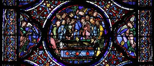 L'étage, qui complète le précédent, représente les spectateurs célestes qui viennent au moment de la mort de Marie. Arrivés devant le lit de mort, « tous se rangent devant le trône de la Vierge, et chantent à l'envi de doux cantiques »[4]. Le Christ, entouré de deux anges, est reconnaissable à son nimbe portant une croix. « C'est ainsi que l'âme de Marie sortit de son corps et s'envola dans les bras de son Fils »[4]. Suivant la tradition iconographique, l'âme est représentée sous la forme d'un nouveau-né, la mort d'un saint étant considérée comme sa « naissance au Ciel »[2]. Autour de lui, deux anges s'exclament « Qui donc est celle qui monte du désert, Appuyée sur son bien-aimé? » (Ct 8:5)[4] De part et d'autre un ange (reconnaissable à son aile verte) désigne la scène à trois autres personnages, représentant peut-être « les patriarches, les martyrs, les confesseurs et les chœurs des vierges »[3]. Le décor urbain montre qu'ils sont présents dans la chambre même. La bordure du vitrail fait référence à cette scène : « Aussitôt les fleurs des roses l'environnèrent, c'était l'assemblée des Martyrs, puis les lys des vallées qui sont les compagnies des Anges, des Confesseurs et des Vierges »[4]. |