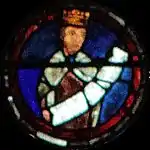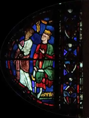 Charlemagne, dont le vitrail fait le pendant de celui-ci dans le déambulatoire nord, marquera ultérieurement une étape ultérieure pour l'occident au VIIIe siècle : c'est par sa dynastie que l'onction a été systématiquement introduite dans le sacre royal, manifestant un basculement dans la légitimité du pouvoir ; par son sacre religieux, le Roi tient son ministère de Dieu (par l’intermédiaire de l’Église), il a pour vocation à ce titre d'être le bras armé de l’Église dans le monde, consacrant la « conception ministérielle de la royauté »[5]. Ces deux vitraux illustrent donc le rapport entre l'autorité spirituelle de l'Église et l'autorité temporelle du souverain au XIIIe siècle, tel qu'il était enseigné par l'Église. Par la suite, la donation de Constantin, apparaissant vers le IXe siècle et dont le caractère inauthentique ne sera établi qu'au XVe siècle, tente de faire remonter cette conception à Constantin lui-même, qui par ce testament inventé sous les carolingiens aurait légué son pouvoir temporel à l'autorité de l'Église.