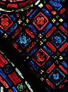 Toutes les scènes des panneaux figuratifs sont dessinés sur fond bleu. Les quadrilobes sont bordés de trois filets intérieurs rouge, bleu et blanc. Les grands cercles sont bordés intérieurement d'une bordure plus complexe, avec une bande rouge centrale, ornée de cercles décorés de fleurs de grisaille, des cercles roses et verts alternant entre des cercles bleus. Cette bande est bordée intérieurement de deux filets bleu et rouge, et extérieurement d'un filet blanc.