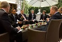 Vladimir Vladimirovitch Poutine (en russe : Влади́мир Влади́мирович Пу́тин [vɫɐˈdʲimʲɪr vɫɐˈdʲimʲɪrəvʲɪt͡ɕ ˈputʲɪn][1] ), né le à Léningrad (aujourd'hui Saint-Pétersbourg), est un homme d'État russe. Depuis 1999, il est la figure centrale de l’exécutif de la nation russe, alternativement comme président du gouvernement (1999-2000 et 2008-2012) et président de la fédération de Russie (par intérim de 1999 à 2000 et de plein exercice de 2000 à 2008 ainsi que depuis 2012).