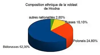 Les Biélorusses représentent 62,3 % de la population. La région compte de nombreuses minorités, dont les Polonais (24,8 %), les Russes (10 %), les Ukrainiens (1,8 %) ainsi que des Tatars, des Lituaniens et d'autres nationalités.