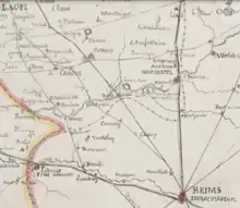 Quittant Reims (Durocortorum) par la porte Mars, emprunte l’avenue de Laon, puis l’avenue Nationale :