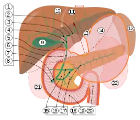 1. Voies biliaires : 2. Voies biliaires intrahépatiques, 3. Voies hépatiques gauche et droite, 4. Voie hépatique commune, 5. Conduit cystique, 6. Conduit cholédoque, 7. Ampoule de Vater, 8. Papille duodénale majeure
