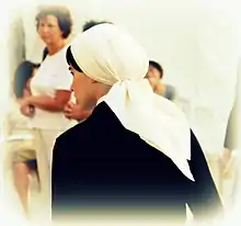 La prise de l'habit monastique symbolise la consécration religieuse, avec notamment chez les moniales le rite liturgique de la « remise du voile » dont les premières traces apparaissent au IVe siècle. Cette cérémonie matérialise la soumission de la religieuse à l'Église comme la femme épousée à son mari[33]. La variété des coiffes féminines semble liée au nombre croissant de congrégations religieuses et la diversité des costumes régionaux dont elles s'inspirent souvent[34]. Le code de droit canonique catholique de 1917 impose que les femmes doivent être séparées des hommes dans les églises et qu'elles doivent y avoir la « tête couverte » et « être vêtues modestement, surtout quand elles s'approchent de la table du Seigneur »[35].