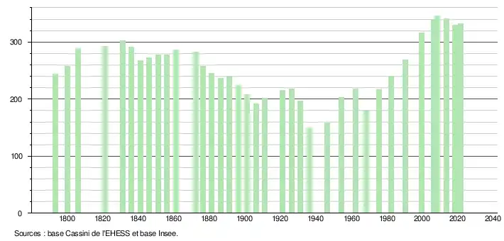 L'évolution du nombre d'habitants est connue à travers les recensements de la population effectués dans la commune depuis 1793. Pour les communes de moins de 10 000 habitants, une enquête de recensement portant sur toute la population est réalisée tous les cinq ans, les populations légales des années intermédiaires étant quant à elles estimées par interpolation ou extrapolation[16]. Pour la commune, le premier recensement exhaustif entrant dans le cadre du nouveau dispositif a été réalisé en 2008[17].