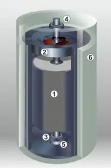 La figure ci-dessus est un schéma du Voss. Le cylindre de béton (1) est porté par un palier magnétique et tourne dans une enceinte sous vide (6) pour supprimer les frottements de l’air. Le palier est composé en partie inférieure d’un roulement à billes (3) et d’une butée magnétique passive (5) qui supporte le poids du volant. En partie supérieure, on retrouve uniquement le roulement à billes (4). Un moteur-alternateur (2) permet de transférer de l’énergie électrique au volant (accélération) puis de la récupérer (freinage). Un convertisseur électronique non représenté transforme la tension continue aux bornes du volant en une tension alternative haute fréquence pour le moteur-alternateur[1].