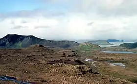 La pente sud du volcan dévale vers l'anse du Volage au fond de la baie des Swains, la pente nord vers les lacs Noir, d'Argoat et d'Enfer (cités d'est en ouest).