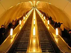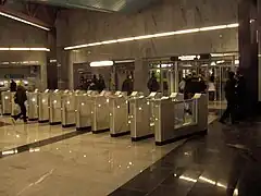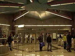 Elle dispose, en surface, d'un hall d'accès, au rez-de-chaussée d'un immeuble commercial. situé à l'ouest de la station, il est en relation avec le quai par un souterrain en pente équipé de quatre escaliers mécaniques prolongé par un couloir et un escalier fixe[2].