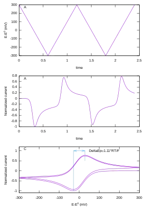 Si le transfert électronique à la surface est rapide et que le courant est limité par la diffusion des espèces vers la surface de l'électrode, et si cette électrode est de suffisamment grande surface, l'intensité du pic de courant est proportionnelle à la racine carrée de la vitesse de balayage (exprimée en V/s). Idéalement, le signal est symétrique et le potentiel rédox de l'analyte est la moyenne des potentiels des pics d'oxydation et de réduction.