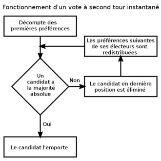 Les électeurs votent en une seule fois en déposant leur liste, et l'on simule alors plusieurs tours, si besoin. On compte d'abord les premières préférences de chacun des candidats. Si un candidat obtient la majorité absolue des voix, il est élu. Sinon, on élimine le candidat qui a recueilli le moins de voix, et on attribue les voix de ses électeurs à leur second candidat préféré. Pour cela, on ajoute une voix aux candidats marqués en seconde préférence de chaque bulletin où le candidat éliminé figurait en premier. On compte à nouveau les voix des candidats en additionnant aux premières voix ces voix supplémentaires obtenues lors du deuxième décompte. Si un candidat obtient la majorité absolue des voix, il est élu. Sinon, on répète l'opération jusqu'à l'obtention d'une majorité absolue, ce qui arrive inévitablement, au plus tard lorsqu'il ne reste plus que deux candidats en lice.