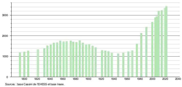 L'évolution du nombre d'habitants est connue à travers les recensements de la population effectués dans la commune depuis 1793. Pour les communes de moins de 10 000 habitants, une enquête de recensement portant sur toute la population est réalisée tous les cinq ans, les populations légales des années intermédiaires étant quant à elles estimées par interpolation ou extrapolation[23]. Pour la commune, le premier recensement exhaustif entrant dans le cadre du nouveau dispositif a été réalisé en 2004[24].