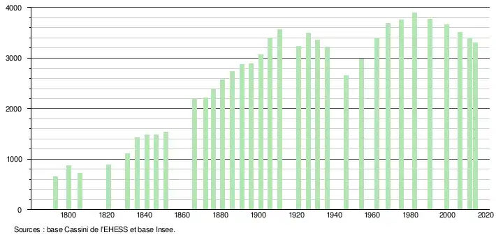 L'évolution du nombre d'habitants est connue à travers les recensements de la population effectués dans la commune depuis 1793. À partir du , les populations légales des communes sont publiées annuellement dans le cadre d'un recensement qui repose désormais sur une collecte d'information annuelle, concernant successivement tous les territoires communaux au cours d'une période de cinq ans. Pour les communes de moins de 10 000 habitants, une enquête de recensement portant sur toute la population est réalisée tous les cinq ans, les populations légales des années intermédiaires étant quant à elles estimées par interpolation ou extrapolation[14]. Pour la commune, le premier recensement exhaustif entrant dans le cadre du nouveau dispositif a été réalisé en 2006[15],[Note 1].