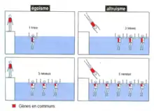 L’altruisme ne se fait pas à n’importe quel prix, cela a été illustré par J. B. S. Haldane qui soulevait la question : Était-il bon de se sacrifier pour sauver son frère ? La réponse est alors non car on peut penser que les individus qui sacrifient une partie de leurs aptitudes au profit des autres ont un désavantage en termes de sélection par rapport à ceux qui ne font pas ce sacrifice. Cependant, il est bon de se sacrifier pour sauver deux frères ou bien huit cousins, le bénéfice pour les gènes étant plus important que de ne rien faire (figure 2).