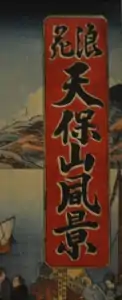 Sur le cartouche rectangulaire rouge qui occupe le coin supérieur droit du premier panneau est écrit : Naniwa/ Tempōzan fūkei. Ce titre identifie clairement la série du tétratriptyque comme appartenant au genre paysager des estampes ukiyo-e connu sous le nom fūkeiga.