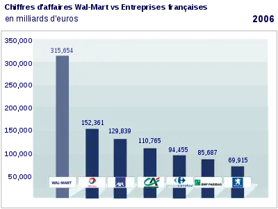 En 2012, Walmart réalise un chiffre d'affaires de 469 milliards de dollars et 17,6 milliards de dollars de bénéfices[27], Walmart est la deuxième entreprise au monde quant au chiffre d'affaires derrière Shell et la première entreprise de grande distribution. Avec 2,1 millions de salariés travaillant dans plus de 6 100 supermarchés et hypermarchés (mais aussi ses filiales). C'est le premier employeur privé aux États-Unis avec 1,2 million, mais aussi celui du Mexique sous la bannière Walmex.
