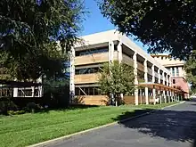 Ses parois étaient en béton et en verre fumé noir, considéré en 1980 comme la seule note discordante du campus[50] mais les murs ont été recouverts en majorité de vigne vierge afin d'adoucir l'impression générale. Le bâtiment de 80 000 pieds carrés (7 432 m2) a été rénové en 2012[51], l'extérieur a été modifié principalement en remplaçant le verre fumé par des lambris.
