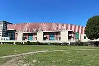- un bâtiment rectangulaire légèrement plus haut aux parois de verre fumé noir et des murs verts.