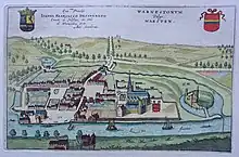 Warneton a été fortifié très tôt, avant 1127, puisque celles-ci ont été détruites lorsque Bertulphe Errembault se réfugia chez son cousin Alard de Warneton après le meurtre de Charles Ier de Flandre[12]. Une enceinte fortifiée est visible sur les plus anciens sceaux de la ville en 1226, et une charte du comte de Flandre confirme la présence de cette fortification. En 1382, après destruction, une reconstruction de grande ampleur a lieu sur ordre de Yolande de Bar, reconstruisant également le château. Ce plan de 1382 est conservé aux Archives du Royaume[13].
