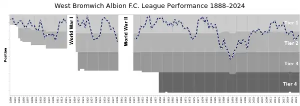 En 1888, West Bromwich Albion fait partie des douze clubs fondateurs de la Football League, le premier championnat anglais[8]. L'équipe remporte sa deuxième Coupe d'Angleterre en 1892 en battant Aston Villa en finale par 3 buts à 0. Les deux clubs se retrouvent en finale de la Coupe trois ans plus tard, mais le trophée revient cette fois à Aston Villa, vainqueur par 1 but à 0. La saison 1900-1901 voit West Bromwich Albion disputer ses premiers matches au stade des Hawthorns, mais elle se termine également par la relégation du club en deuxième division. West Bromwich Albion retrouve la première division dès l'année suivante, pour être à nouveau relégué en 1904[9]. Cette fois-ci, le club doit attendre sept saisons avant d'obtenir sa promotion. Il dispute sa sixième finale de Coupe d'Angleterre l'année suivante, en 1912, mais la victoire revient à Barnsley, un club de deuxième division[10].