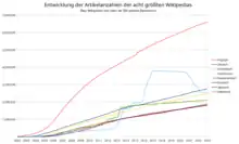 Depuis sa création, le contenu de l'encyclopédie Wikipédia n'a cessé de grandir, en quantité, dans des proportions difficilement imaginables à ses débuts. Au départ comparable aux autres encyclopédies existantes, elle les a rapidement dépassées en taille et en couverture[49]. Wikipédia est l'un des sites les plus fréquentés au monde, recevant plus de 700 millions de visites quotidiennes à la fin 2022[50]. Il constitue le plus grand et le plus populaire des ouvrages de références générales d'Internet, comptabilisant 190 millions de pages disponibles fin 2022[51].