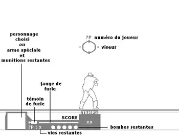 Il arrive que des ennemis passent sur le plan du personnage pour le frapper. Appuyer sur le bouton tir permet au joueur de leur asséner un coup de crosse. Les bâtons de dynamite lancés par certains ennemis peuvent être ramassés avant qu'ils n'explosent et être relancés dans le décor.