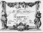 L'aristocratie investit dans des propriétés rurales, laissant l'industrie et le commerce se développer dans la capitale. Dans ce contexte, les nouveaux bourgeois sont dépensiers, ce qui crée un marché propice à l'art du graveur, également favorisé par la demande populaire de gravures d'actualité et d'estampes satiriques[6]. Peu adapté au système éducatif mais doté d'une perception aiguë du monde qui l'entoure, William Hogarth dessine beaucoup et rend régulièrement visite à l'atelier d'un peintre local. Pour échapper à la pression de son père, il entre à l'âge de quinze ans environ[7],[8] comme apprenti dans l'atelier d'Ellis Gamble, orfèvre et graveur sur métaux (actif de 1712 à 1733), membre de la Merchant Taylor's Company, sur Blue Cross Street (Leicester Fields), chez qui il semble qu'il se soit installé[7]. Il grave des emblèmes sur des pièces d'orfèvrerie en or et argent jusqu'en 1720, des armoiries, des cartes-adresses (trade cards), petites pièces de gravure reportée sur papier épais destinées aux artisans et fournisseurs londoniens, ainsi que des ex-libris[9],[10]. Hogarth, frustré par un travail trop cadré, appelle ces armoiries les « monstres de l'héraldique » et les spécialistes considèrent qu'il y a perdu de nombreuses années cruciales pour son développement comme artiste[réf. nécessaire]. Il développe néanmoins par lui-même des techniques peu orthodoxes, et son originalité comme artiste tient beaucoup à son pragmatisme et à son approche non conventionnelle de sa carrière[7].