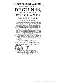 En 1734, le capitaine Snelgrave publie Nouvelle relation de quelques endroits de Guinée et du commerce d'esclaves qu'on y fait[2]. Il dédie le livre aux commerçants européens de l'Afrique de l'Ouest.