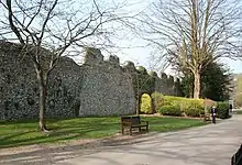 Les murs de la ville, construits à l'époque romaine et couvrant une superficie d'environ 138 acres (56 ha), sont reconstruits et agrandis par sections au fil du temps. Une grande partie, construite sur des fondations romaines, est démolie auxXVIIIe et XIXe siècles alors qu'elle tombe en ruine ; les portes sont devenues un obstacle à la circulation et un danger pour les piétons, avec seulement une petite partie du mur romain d'origine[33],[34]. Des six portes (nord, sud, est, ouest, Durn et King's Gates), seules Kingsgate et Westgate survivent, avec des sections des murs autour des deux portes et près des ruines du château de Wolvesey[35].