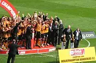 Ce n'est que la saison suivante que les résultats arrivèrent. Après un début de saison impressionnant, et emmené par son duo Sylvan Ebanks-Blake et Chris Iwelumo, Wolverhampton se hisse en tête du classement dès la fin du mois d'août et ne quitte plus jamais les deux premières places. Le , la promotion fut officiellement assurée après une victoire face à QPR et la semaine suivante, les Wolves remportent officiellement le championnat, leur premier titre de champions depuis la saison 1988-1989.