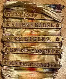 Les agrafes de combat (Battle Clasp) de l'armée de terre américaine (US Army) suivantes, portant le nom de la bataille, étaient portées sur la médaille pour indiquer la participation à des conflits terrestres majeurs[1].