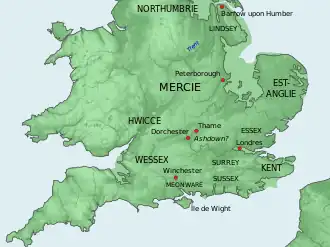 La montée en puissance mercienne constitue une menace pour le Wessex, dont l'autorité sur la haute vallée de la Tamise est remise en question. La Chronique anglo-saxonne signale que Wulfhere ravage Ashdown (dont l'emplacement exact est inconnu, mais se situe quelque part dans les Berkshire Downs) en 661. Vers la même période, le siège épiscopal saxon de Dorchester est divisé en deux avec la création d'un évêché à Winchester. Cette décision est vraisemblablement le résultat des progrès merciens dans la région de Dorchester, une ville devenue dangereusement proche de la frontière entre les deux royaumes. L'évêché de Dorchester est abandonné peu de temps après, probablement vers le milieu des années 660[43],[44].