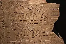 - 2150-2134 av. J.-C.[11] (dates supposées[12]) : VIIe et VIIIe dynasties à Memphis. La VIIe dynastie est éphémère (Manéthon note : « 70 rois-70 jours »), voire fictive[9]. La VIIIe dynastie comprend vingt-sept souverains, et aurait duré cent-quante-deux ans selon Manéthon[13]. Les gouverneurs du sud auraient formé à cette époque un royaume indépendant avec le gouvernement de la région de Coptos. Le nord est aux mains des Asiatiques (Âamou) et la région de Memphis dirigée par les descendants des rois de l'Ancien Empire.