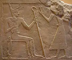 Bas-relief en calcaire de Montouhotep recevant des offrandes (antiquité égyptienne du musée du Louvre)