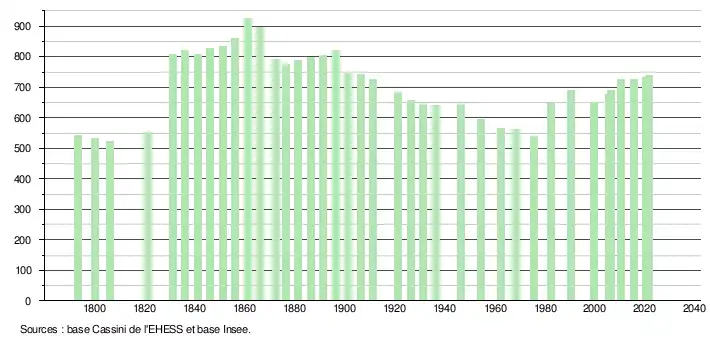 L'évolution du nombre d'habitants est connue à travers les recensements de la population effectués dans la commune depuis 1793. Pour les communes de moins de 10 000 habitants, une enquête de recensement portant sur toute la population est réalisée tous les cinq ans, les populations légales des années intermédiaires étant quant à elles estimées par interpolation ou extrapolation[17]. Pour la commune, le premier recensement exhaustif entrant dans le cadre du nouveau dispositif a été réalisé en 2005[18].