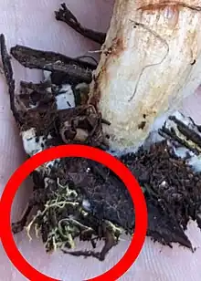 - Cuticule trichodermique faite d'hyphes dressées de 5-15 µm à pigmentation brune[6].