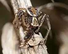 Pour s'accoupler, le mâle saisit l'une des pattes de la femelle, la tenant jusqu'à ce qu'elle cesse de se débattre, il utilise ensuite de la soie pour l'immobiliser au sol, puis il se glisse sous elle et s'accouple[2].
