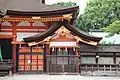 - Le haiden : le bâtiment consacré aux offrandes est à la gauche du centre du sanctuaire. La partie d'en face, avec son chōzuya, bassin d'eau servant à la purification, est consacrée aux cérémonies religieuses.