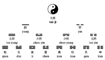 - Le commentaire sur l'explication des trigrammes, Shuo gua 說卦, explique la signification des huit trigrammes formant les hexagrammes, en leur donnant des corrélations abstraites, et aussi dans le monde animal, les parties du corps, les membres de la famille, les directions, les pierres, les métaux, etc.[48]. Par exemple le début du troisième paragraphe forme des couples de trigrammes :