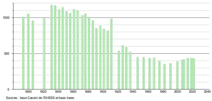 L'évolution du nombre d'habitants est connue à travers les recensements de la population effectués dans la commune depuis 1793. Pour les communes de moins de 10 000 habitants, une enquête de recensement portant sur toute la population est réalisée tous les cinq ans, les populations légales des années intermédiaires étant quant à elles estimées par interpolation ou extrapolation[31]. Pour la commune, le premier recensement exhaustif entrant dans le cadre du nouveau dispositif a été réalisé en 2008[32].