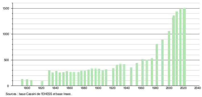L'évolution du nombre d'habitants est connue à travers les recensements de la population effectués dans la commune depuis 1793. Pour les communes de moins de 10 000 habitants, une enquête de recensement portant sur toute la population est réalisée tous les cinq ans, les populations légales des années intermédiaires étant quant à elles estimées par interpolation ou extrapolation[25]. Pour la commune, le premier recensement exhaustif entrant dans le cadre du nouveau dispositif a été réalisé en 2005[26].