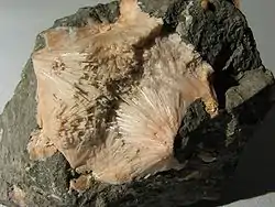 Natrolite ; zéolithe de formule Na2[Si3AlO10] (Val de Fassa à Monzoni (Italie). Le caractère fibreux de certaines zéolithes les rend susceptible de produire des mésothéliomes (comme l'amiante) si elles sont inhalées en fines particules