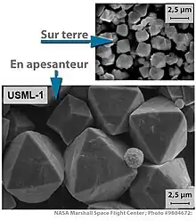 Des cristaux de zéolite "cultivés" sur terre (en haut) sont plus petits et moins réguliers que ceux produits dans l'espace (en bas). Cette expérience conduite avec le "Center for Advanced Microgravity Materials Processing at Northeastern University in Boston" visait à mieux comprendre la synthèse des zéolithes pour notamment améliorer le traitement du pétrole et réduire les coûts des carburants